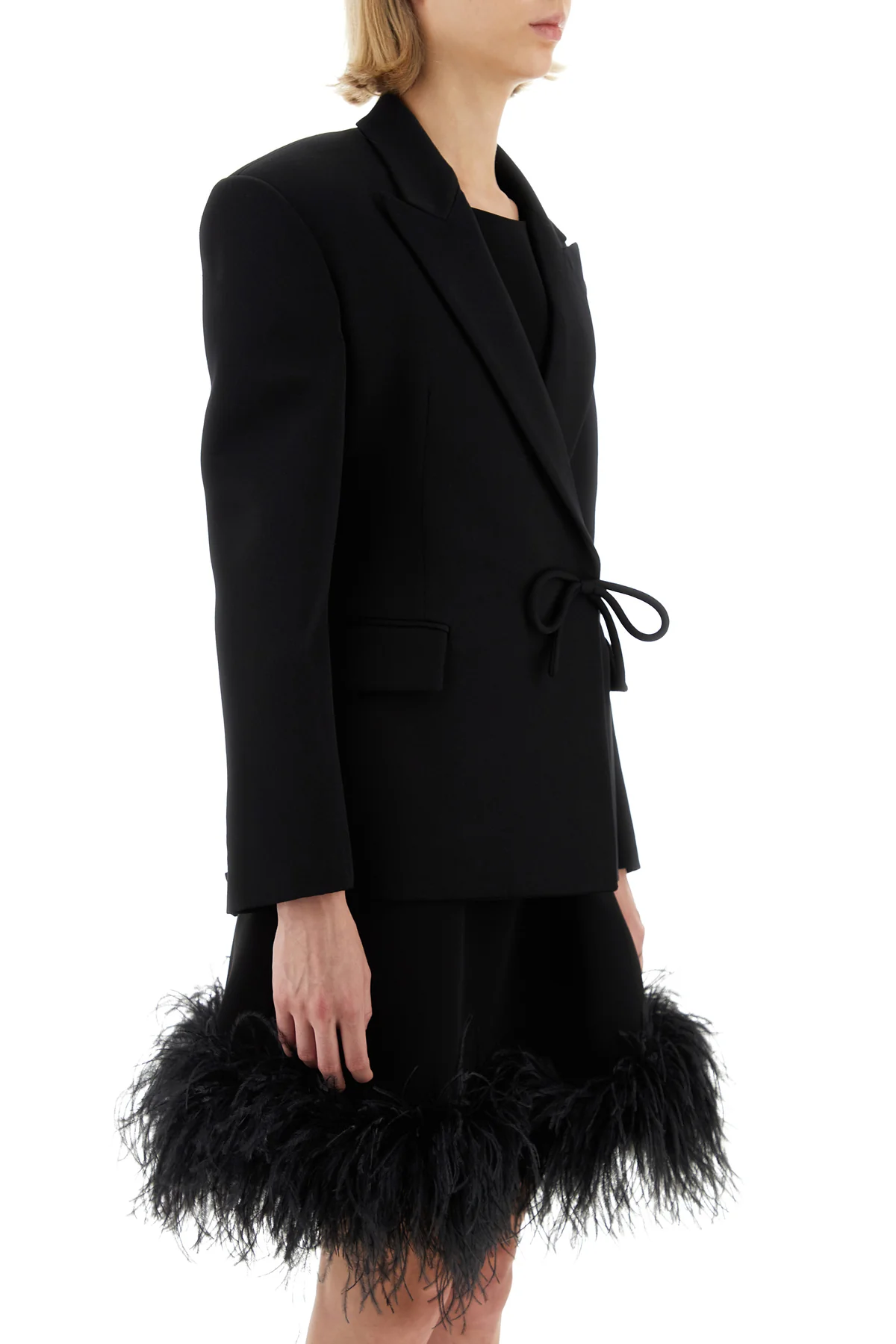 Giacca realizzata in pura lana vergine arricchita da fiocco decorativo tonale sulla parte frontale.