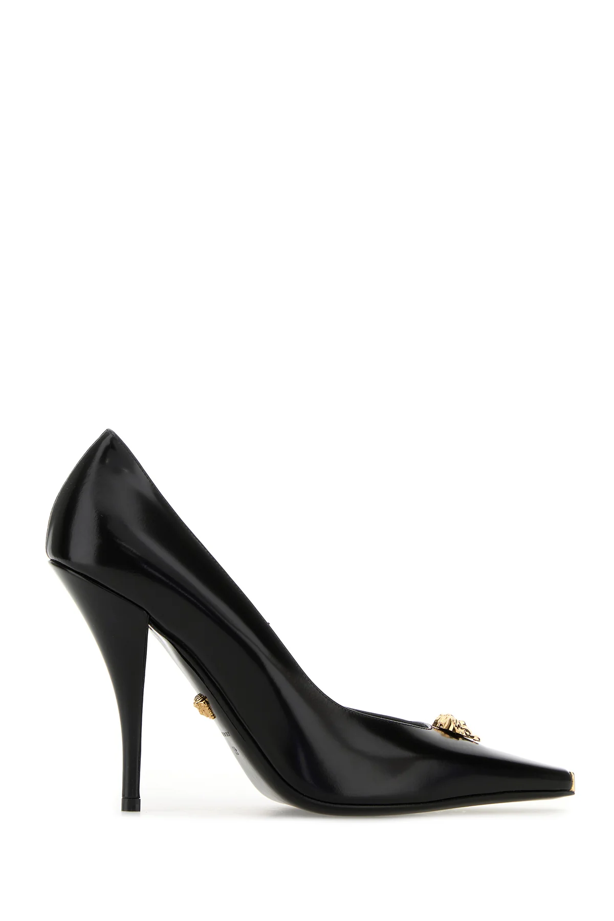 Scarpe con tacco realizzate in pelle dal finish lucido arricchite da dettaglio metallico Medusa sul collo del piede e targhetta metallica sulla punta smussata.
